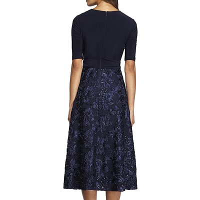 Our t-length party dress has a solid stretch top, full soutache sequin skirt and tie belt that is perfect for any evening event.